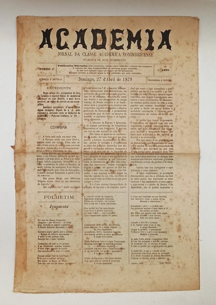 10762 – ACADEMIA. JORNAL DA CLASSE ACADEMICA CONIMBRICENSE. Nº 17. DOMINGO. 27 DE ABRIL DE 1879. 1º ANNO. [4] pp. 43 cm x 29 cm. B.