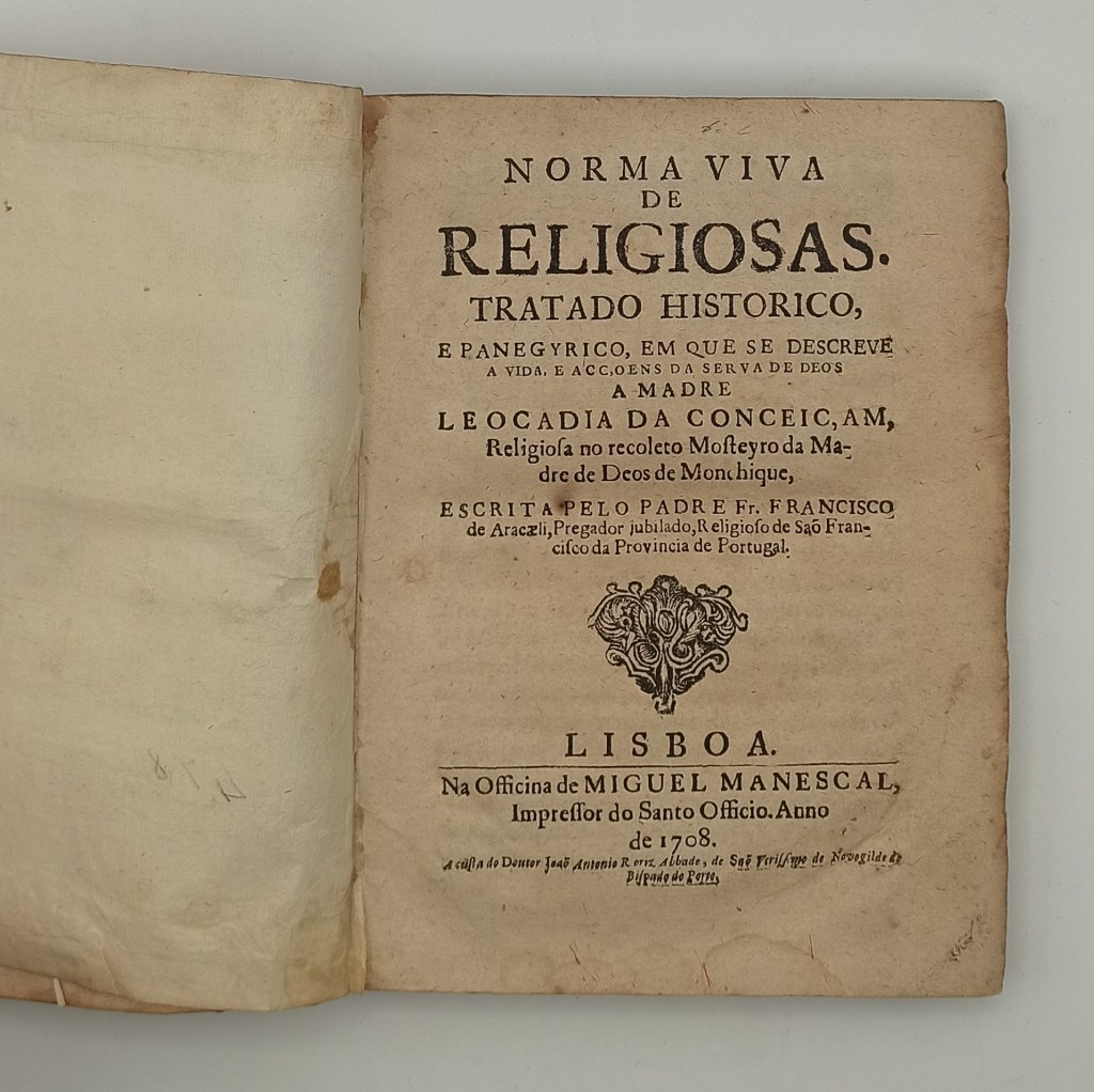 10427 – Aracaeli, Francisco de (Frei) – NORMA VIVA DE RELIGIOSAS. TRATADO HISTORICO E PANEGYRICO, EM QUE SE DESCREVE A VIDA, E ACÇOENS DA SERVA DE DEOS A MADRE LEOCADIA DA CONCEIÇÃO, RELIGIOSA NO RECOLETO MOSTEYRO DA MADRE DE DEOS DE MONCHIQUE (…). Lisboa. Na Offinina de Miguel Manescal, Impressor do Santo Officio. Anno de 1708. (24) -171 – (2) pp. 19 cm x 14 cm. E.