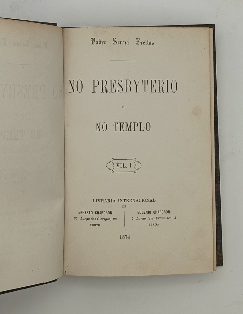 10172 – [CATOLICISMO. VIAGENS. PORTUGAL. BRASIL] -Freitas, José Joaquim Senna – NO PREBISTÉRIO E NO TEMPLO. Porto. Livraria Internacional Enresto Chardron. 1874. II VOLUMES. 292 pp.; 344 pp. 17, 5 cm x 11 cm. E.