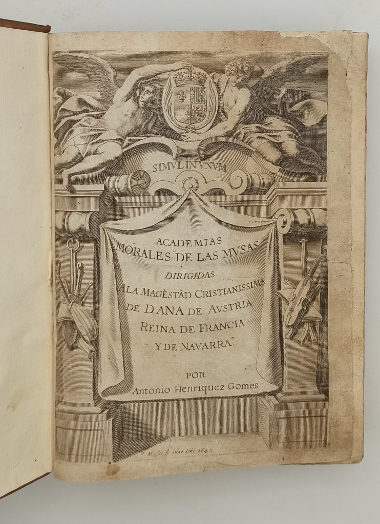 10410 – [SIGLO DE ORO. JUDAICA] Henriquez Gomez, Antonio (Antonio Enríquez Gomez) – ACADEMIAS MORALES DE LAS MUSAS. Estãpado en Bourdeaux por el Señor Pedro de La Court. 1642. [24] – [1] – 478 – [6] pp. 22 cm x 16 cm. E.