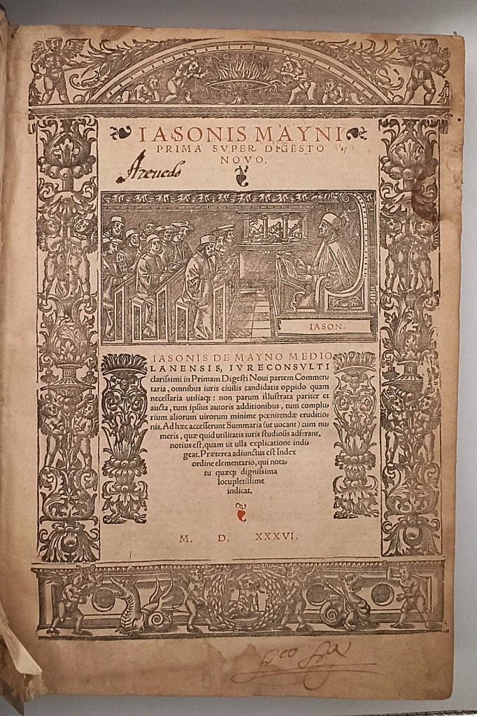 Giasone del Maino integrou a chamada escola dos pós-glosadores, que aplicava a metodologia escolástica tanto ao direito civil como ao direito canónico. Morreu em Pavia em 1519. As sua obras, nomeadamente este “Digesto Novo” tiveram grande impacto na Europa do seu tempo. Conhecem-se edições das suas obras em diversos países europeus ao longo do século XVI.