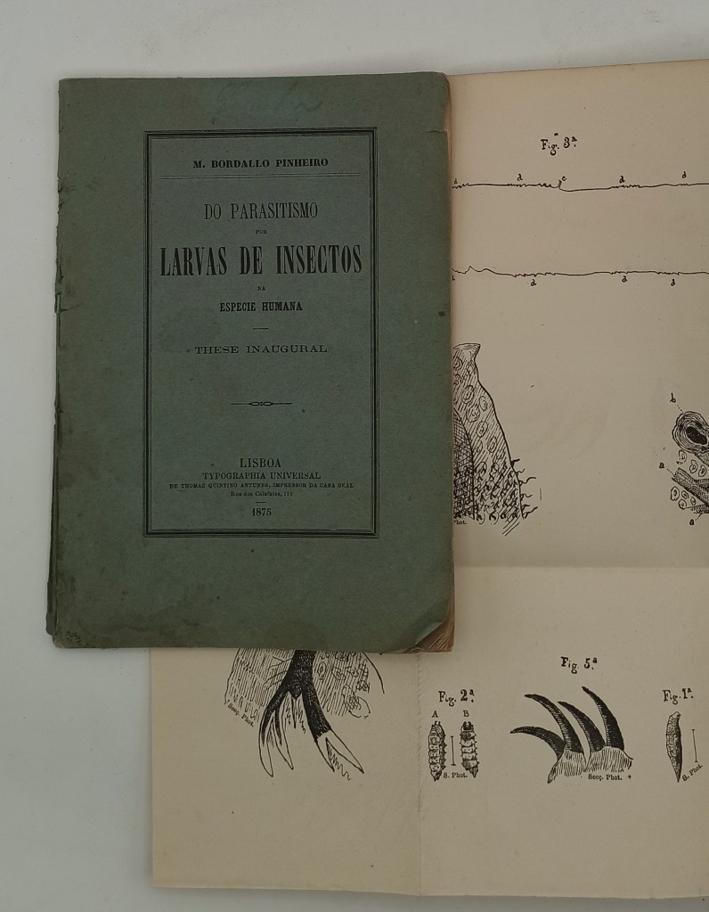 Trabalho de Manuel Maria Bordallo Prostes Pinheiro (n. 1850) sobre o parasitismo por larvas no organismo humano. Este trabalho, apresentado como “These Inaugural” na Escola Medico-Cirurgica de Lisboa, foi fruto de uma observação de um caso concreto dos “trinta e dois vermes” expulsos por uma mulher, estudados e observados por Bordallo Pinheiro que os apresenta “numa estampa representando ora a lavra inteira, ora as suas diferentes partes augmentadas conveninentemente para que possa perceber-se-lhe bem os acidentes (…)”.