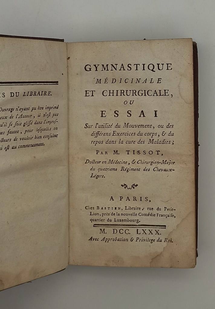 Primeira edição desta obra onde o médico Clément Joseph Tissot (1747 – 1826) introduz a ginástica (fisioterapia) enquanto elemento essencial para recuperação do paciente (uma técnica que contrasta com os longos períodos de imobilização que até então eram recomendados como cura para grande parte dos males).