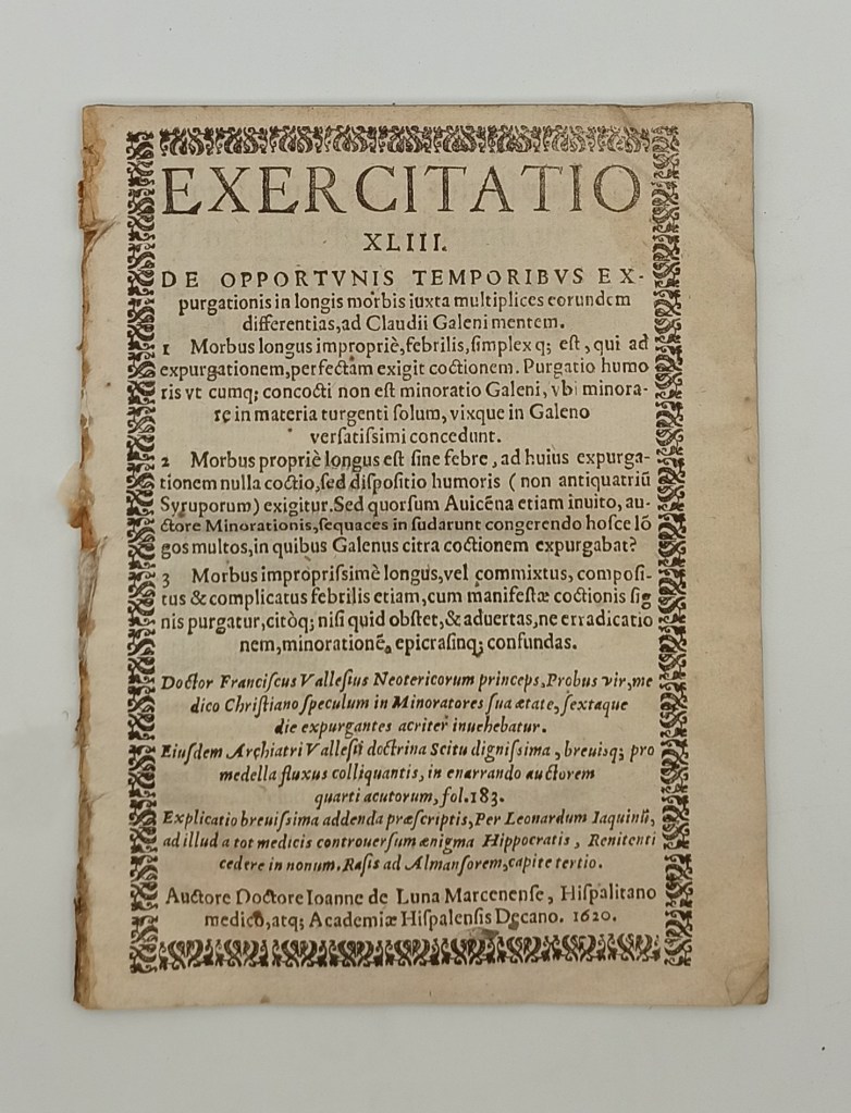 9115 – [MEDICINA. ESPANHA. ÚNICO EXEMPLAR CONHECIDO NO MUNDO] – Marcenense, Juan de Luna (Juan de Luna Veja) EXERCITATIO XLIII. DE OPORTVNIS TEMPORIBVS EXPORGATIONIS IN LONGIS MORBIS IUXTA MULTIPLICES CORUDEM DIFFERENTIAS, AD CLAUDI GALENI MENTEM…[SEVILHA]. 1620. [40pp.] 19 cm x 14, 8 cm. B.
