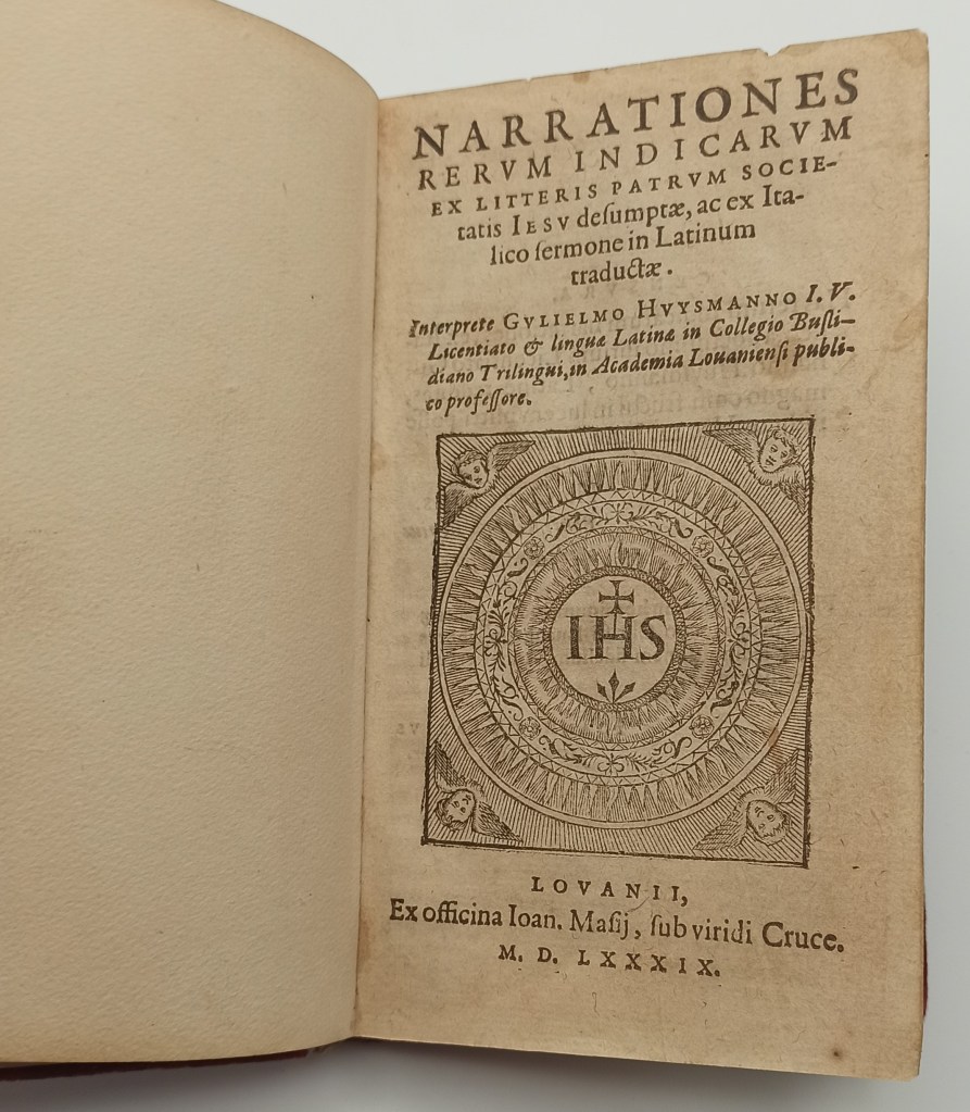 8395 – [NAUFRÁGIO DA NAU SANTIAGO. CARTAS DO JAPÃO] – Huysmannus, Gulielmus (ed.) – NARRATIONES RERUM INDICARUM EX LITTERIS PATRUM SOCIETATIS JESU. Lovanii. Ex. Officina Joan Masii, sub vriridi Cruce. 1589. 142 pp. 15 cm x 9 cm E. a-h//8; i//7