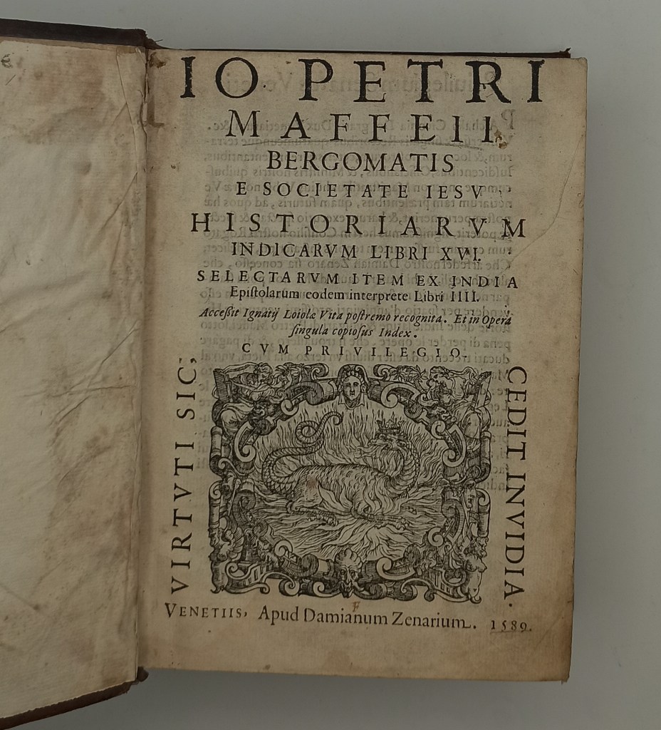 – HISTORIARUM INDICARUM LIBRI XVI. Venetiis. Apud Damianu, Zenarium. 1589. (56 pp) – 281 [fl. num]. 19 cm x 14 cm. E.