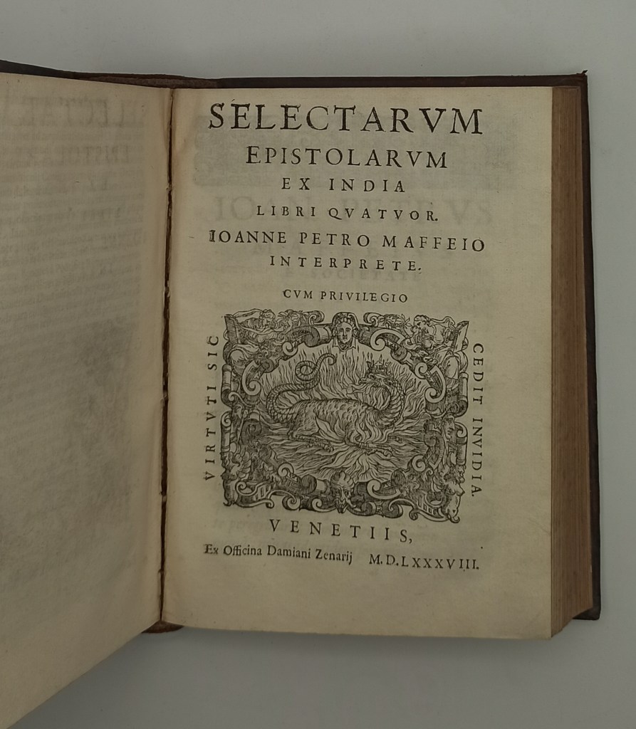 – SELECTARUM EPISTOLARUM EX INDIA LIBER QVATVOR. Venetiis. Ex. Offinina Damiani Zenarii. 1588. 211 [fl. num]. 19 cm x 14 cm. E.
