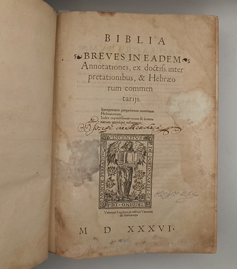 Obra de generosas dimensões e de elevado apuro gráfico, esta Bíblia editada através de uma reunião de esforços de três grandes livreiros e impressores estabelecidos em Lyon no século XVI: Jacques Giunta, Vincent de Portonariis e Scipion de Gabiano. O livro apresenta belíssimas capitulares e esquemas explicativos, notas e marginália sendo por isso uma verdadeira jóia da tipografia francesa do século XVI.