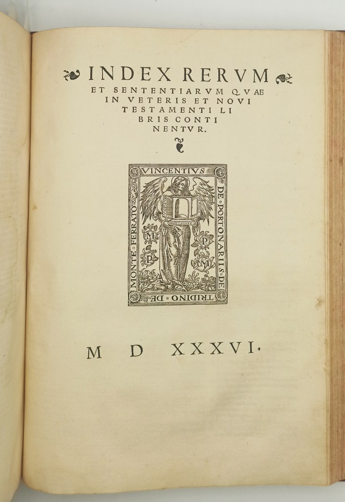 INDEX RERUM ET SENTENTIRAUM QUAE IN VETERIS ET NOVI TESTAMIT LIBRIS CONTINENTUR. [LYON]. Vicentius de Portonariis. 1536. 81 fl. 33, 3 cm x 23, 5 cm. E.