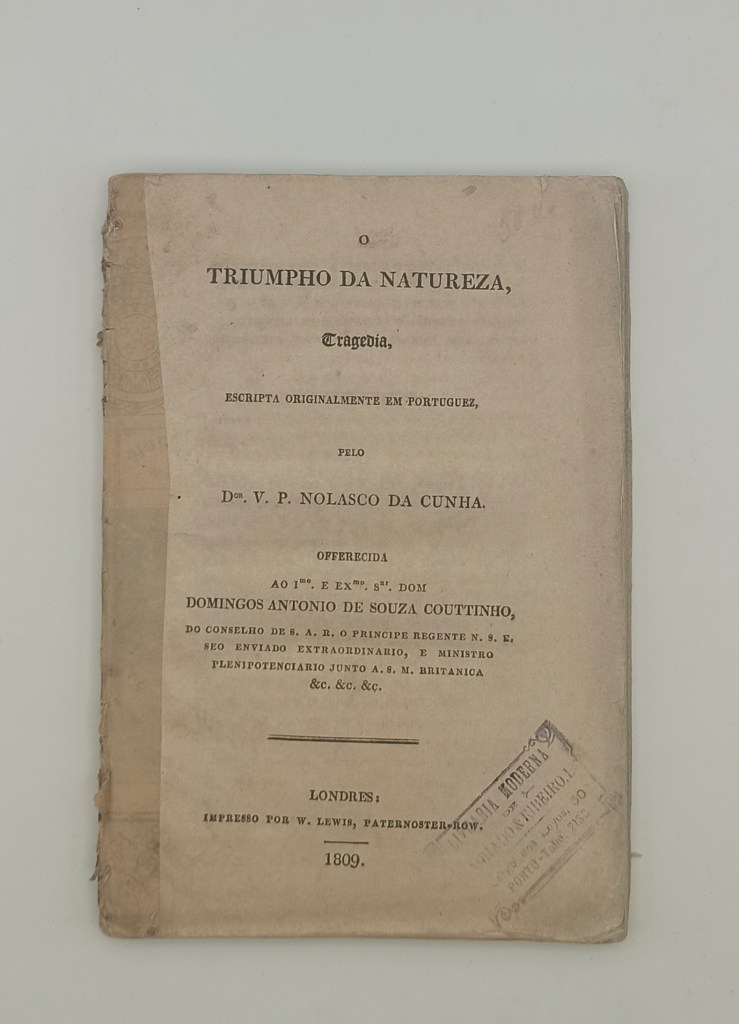 10888 – Cunha, Vicente Pedro Nolasco da – O TRIUMPHO DA NATUREZA, TRAGEDIA. ESCRIPTA ORIGINALMENTE EM PORTUGUEZ PELO DOR. V. P. NOLASCO DA CUNHAL. OFFERECIDA AO ILMO. E EX.MO. SR. DOM DOMINGOS DE SOUZA COUTTINHO…Londres. Impresso por W. Lewis, Paternoster-Row. 1809. 98 pp. 20 cm x 14 cm. B.