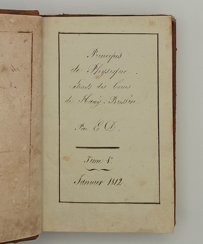 8425 – [CIÊNCIA. FÍSICA. ÓPTICA. ELECTRICIDADE] – E. D. (autor do manuscrito); Brisson, Mathurin Jacques; Haury, René Just (Abbé Hauy) – PRINCIPES DE PHYSIQUE EXTRAITS DES COURS DE HAUY Y BRISSON. 1812. 2 VOLUMES. 188 pp. – 99 pp. E.