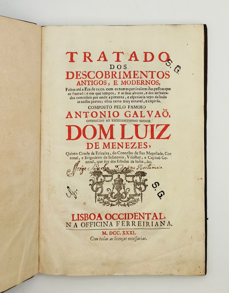 10425 – Galvão, António – TRATADO DOS DESCOBRIMENTOS ANTIGOS, E MODERNOS, FEITOS ATÉ A ERA DE 1550 COM OS NOMES PARTICULARES DAS PESSOAS QUE OS FIZERAM: E EM TEMPOS, E AS SUAS ALTURAS, E DOS DESVAIRADOS CAMINHOS POR ONDE A PIMENTA, E ESPECIARIA VEYO DA INDIA ÁS NOSSAS PARTES; OBRA CERTO MUY NOTAVEL E COPIOSA, COMPOSTO PELO FAMOSO ANTONIO GALVAÕ OFFERCIDO AO EXCELENTISSIMO SENHOR DOM LUIZ DE MENEZES, QUINTO CONDE DA ERICEIRA, DO CONSELHO DE SUA MAGESTADE, CORONEL E BRIGADEIRO DE INFANTARIA, VISOREY, E CAPITÃO GENERAL, QUE FOI DOS ESTADOS DA INDIA &C. Lisboa Occidental. Na Officina Ferreiriana. 1731. (16) – 100 pp. 28 cm x 19 cm. E.