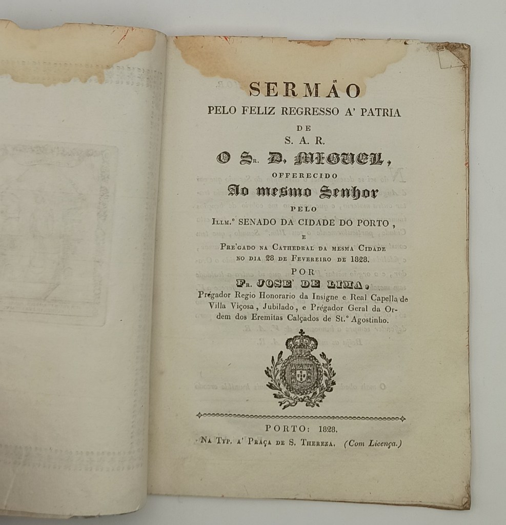 10159 – Lima, Fr. José de – SERMÃO PELO FELIZ REGRESSO À PÁTRIA DE S. A. R. O SR. D. MIGUEL, OFFERECIDO AO MESMO SENHOR PELO ILLMº SENADO DA CIDADE DO PORTO. E PREGADO NA CATHEDRAL DA MESMA CIDADE NO DIA 28 DE FEVEREIRO DE 1828 POR FR. JOSÉ DE LIMA…Porto. Na Typ. Á Praça de S. Thereza. 39 pp. 20 cm x 13, 5 cm. B.