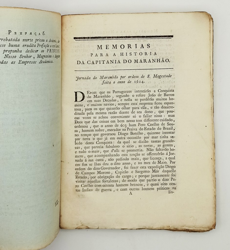 10666 – Moreno, Diogo de Campos – COLLECÇÃO DE NOTICIAS PARA A HISTORIA E GEOGRAFIA DAS NAÇÕES ULTRAMARINAS, QUE VIVEM NOS DOMINIOS PORTUGUEZES, OU LHES SÃO VISINHAS: PUBLICADA PELA ACADEMIA REAL DAS SCIENCIAS. TOMO I. Numº.IIII. – MEMÓRIAS PARA A HISTÓRIA DA CAPITANIA DO MARANHÃO. LISBOA. Na Typografia da mesma Academia. 1812. VIII – 118 – 2 pp. 21, 5 cm x 14 cm. B.