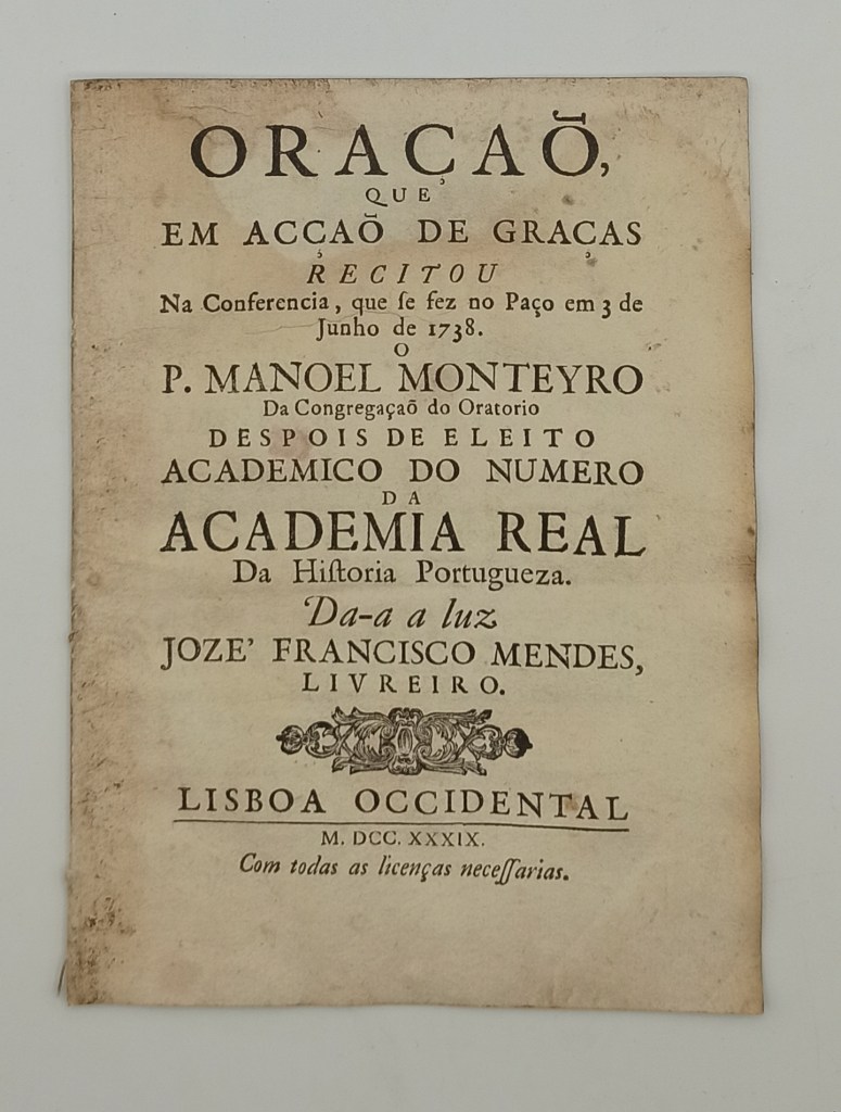 10887 – Monteyro, Manuel (Padre) – ORAÇAÕ QUE EM ACÇÃO DE GRAÇAS RECITOU NA CONFERENCIA, QUE SE FEZ NO PAÇO EM 3 DE JUNHO DE 1738 O P. MANOEL MONTEYRO DA CONGREGAÇÃO DO ORATÓRIO DEPOIS DE ELEITO ACADEMICO DO NUMERO DA ACADEMIA REAL DA HISTORIA PORTUGUEZA. Lisboa Occidental. Ed. de Joze Francisco Mendes Livreiro. 1739. 9 págs. 19, 7cm. B.