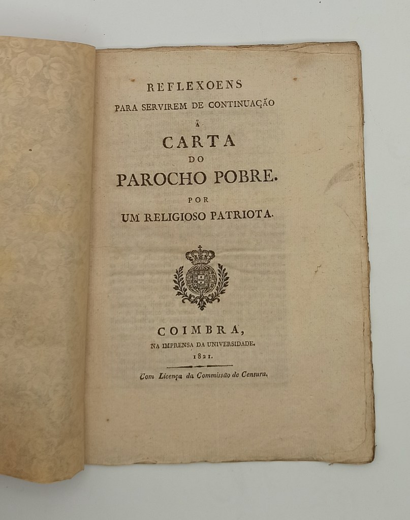 10539 – REFLEXÕENS PARA SERVIREM DE CONTINUAÇÃO Á CARTA DO PAROCHO POBRE POR UM RELIGIOSO PATRIOTA. Coimbra. Imprensa da Universidade. 1821. 12 pp. 21, 5 cm x 15 cm. B.