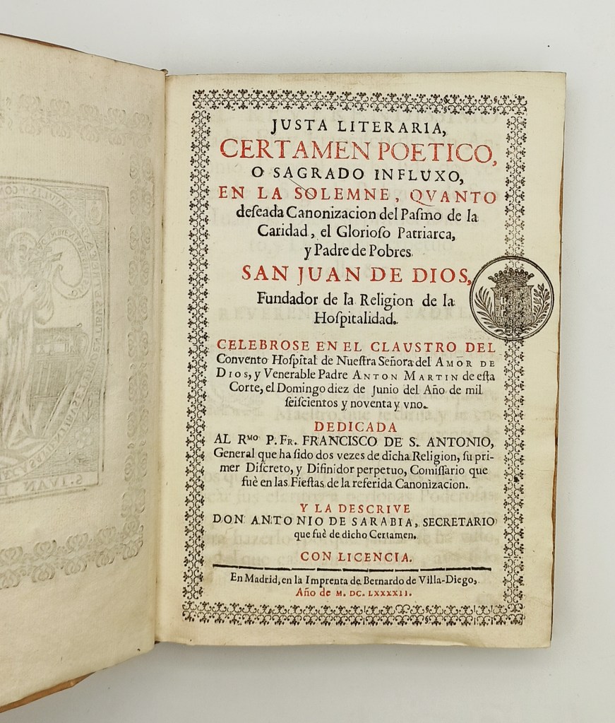 10426 – Sarabia, Antonio de (Don) [desc.] – JUSTA LITERARIA. CERTAMEN POETICO, O SAGRADO INFLUXO, EN LA SOLEMNE, QUANTO DESEADA CANONIZACION DEL PASMO DE LA CARIDAD, EL GLORIOSO PATRIARCA Y PADRE DE LOS POBRES SAN JUAN DE DIOS, FUNDADOR DE LA RELIGION DE LA HOSPITALIDAD. CELEBROSE EN EL CLAUSTRO DEL CONVENTO HOSPITAL DE NUESTRA SEÑORA DEL AMOR DE DIOS, Y VENERABLE PADRE ANTON MARTIN DE ESTA CORTE, EL DOMINGO DIEZ DE JUNIO DEL AÑO DE MIL SEISCIENTOS Y NOVENTA Y UNO. DEDICADA AL RMO. P. FR. FRANCISCO DE S. ANTONIO…En Madrid en la Imprenta de Bernardo de Villa-Diego. 1692. (1) – (22) – 375 pp. 20 cm x 14 cm. E.