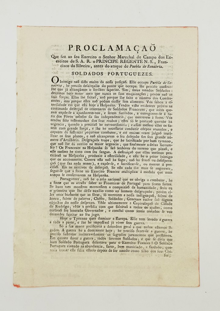4821 – Silveira, Francisco da – PROCLAMAÇÃO QUE FEZ AO SEU EXERCITO O SENHOR MARECHAL DE CAMPO DOS EXERITOS DE S.A.R. O PRINCIPE REGENTE N.S. FRANCISO DA SILVEIRA, ANTES DO ATAQUE DE PUEBLA DE SANABRIA. Lisboa. Na Regia Typographia Silviana. [1810] 1 fl. 28 cm x 19, 5 cm. B.