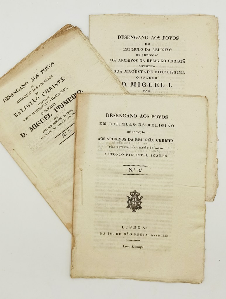 – DESENGANO AOS POVOS OU ADDICÇÃO AOS ARCHIVOS DA RELIGIÃO CHRISTÃ. OFFERECIDO A SUA MAGESTADE O SENHOR D. MIGUEL PRIMEIRO…Nº 3. Lisboa. Na Impressão Regia. 1830. 18 pp. 22 cm x 15 cm. B.