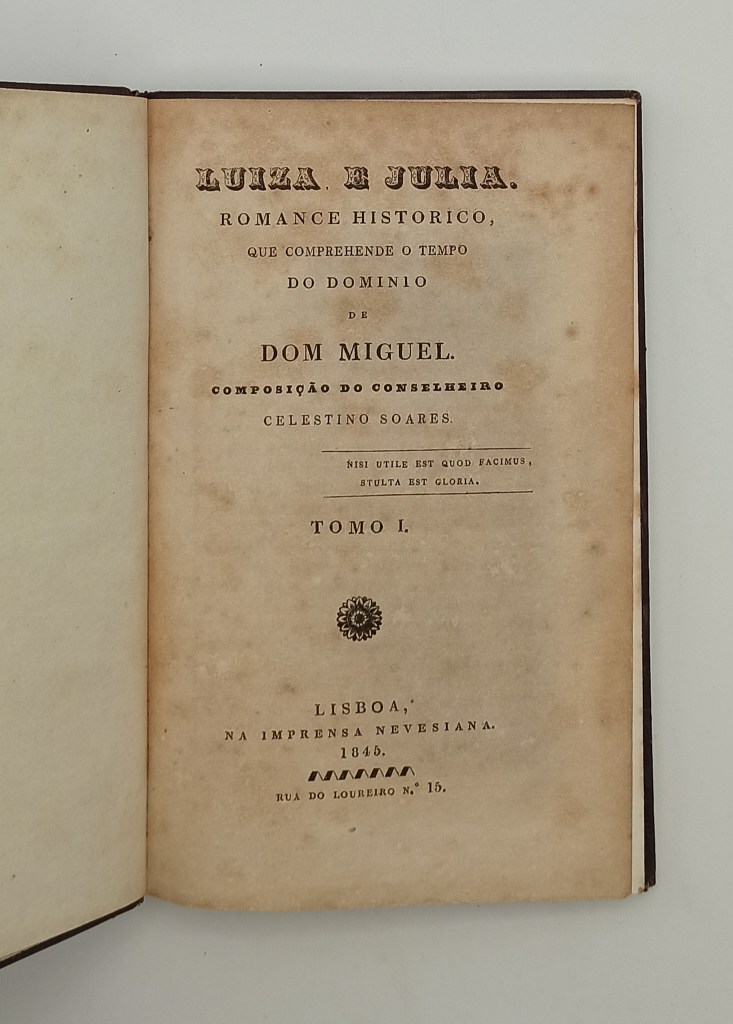 10542 – Soares, Celestino – LUIZA E JULIA. ROMANCE HISTÓRICO QUE COMPREHENDE O TEMPO DO DOMINIO DE DOM MIGUEL…Tomo I e Tomo II. Lisboa. Na Imprensa Nevesiana. 1845. 215 pp; 271 pp. 19 cm x 11, 5 cm. E.