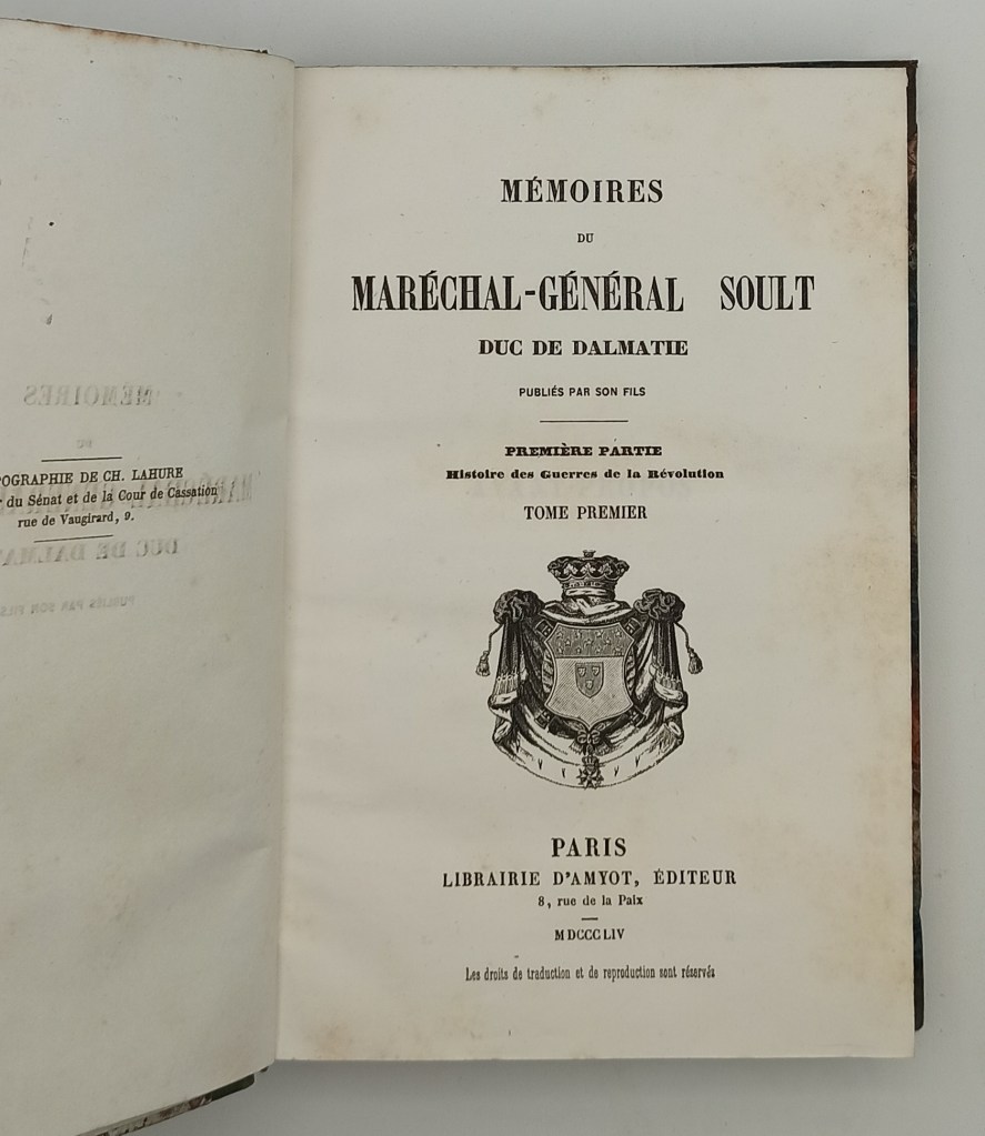 10083 – Soult, Jean-de-Dieu – MÉMOIRES DU MARÉCHAL-GÉNÉRAL SOULT DUC DE DALMATIE. PUBLIÉS PAR SON FILS. Paris. Librairie d’Aymot, Éditeur. 1854. 3 VOLUMES. XII – 387 pp.; 372 pp. 407 pp. 20 cm x 13 cm. E.