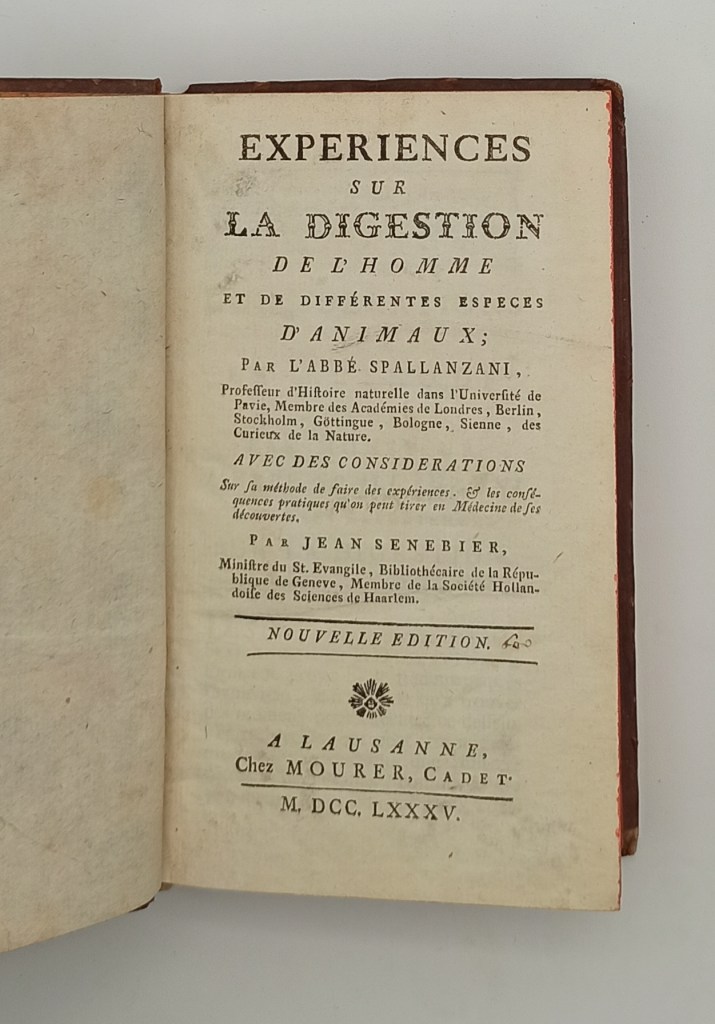 10765 – [CIÊNCIA. MEDICINA.] – Spallanzani, Abbé; Senebier, Jean – EXPERIENCES SUR LA DIGESTION DE L’HOMME ET DE DIFFÉRENTES ESPECES D’ANIMAUX (…) AVEC DES CONSIDERATIONS SUR SA MÉTHODE DE FAIRE DES EXPÉRIENCES & LES CONSEQUENCES PRATIQUES QU’ON PEUT TIRER EN MÉDECINE DE SES DÉCOUVERTS. NOUVELLE EDITION. A Lausagne. Chez Mourer Cadet. 1785. CXXVIII – 336 pp. 16. 5 cm x 9,5 cm. E.