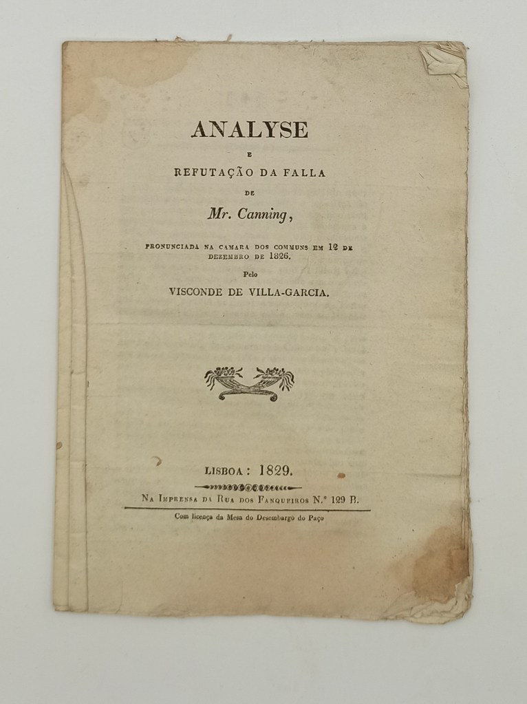 10087 – Villa-Garcia, Visconde de – ANALYSE E REFUTAÇÃO DA FALLA DE MR. CANNING, PRONUNCIADA NA CÂMARA DOS COMUNS EM 12 DE DEZEMBRO DE 1826 PELO VISCONDE DE VILLA-GARCIA. Lisboa. Na Imprensa da Rua dos Fanqueiros. 1829. 30 pp. 21, 5 cm x 15 cm. B.