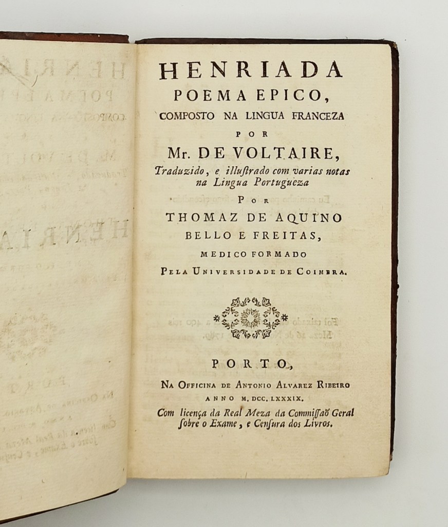 10727 – Voltaire – HENRIADA. POEMA EPICO, COMPOSTO NA LINGUA FRANCEZA POR MR. DE VOLTAIRE. TRADUZIDO, E ILLUSTRADO COM VARIAS NOTAS NA LINGUA PORTUGUEZA POR THOMAS DE AQUINO BELLO DE FREITAS MEDICO FORMADO PELA UNIVERISDADE DE COIMBRA. Porto. Na Officina de Antonio Alvarez Ribeiro. 1789. 16 – (1) – 263 – (1) pp. 16 cm x 9, 5 cm. E.