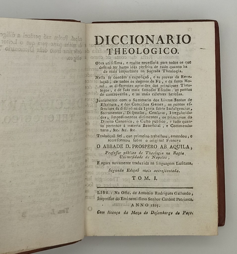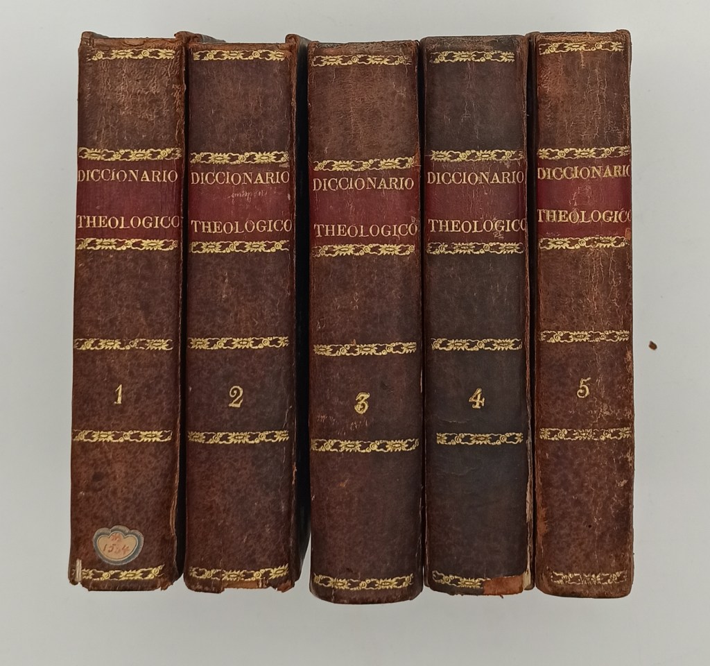 6396 – Aquila, Abade Prospero; Espiricto Santo Monte, Frei José do (traductor) – DICCIONARIO THEOLOGICO…TRADUCÇÃO FIEL, QUE PRIMEIRO TRABALHOU, EMENDOU E ACCRESCENTOU SOBRE O ORIGINAL FRANCEZ O ABBADE D. PROSPERO AB AQUILA…Lisboa. Na Officina de António Rodrigues Galhardo. 1803. 5 Volumes. 393pp; 397pp; 459 pp; 389 pp; 397 – [8] pp. 14, 8 cm x 9, 5 cm. E.