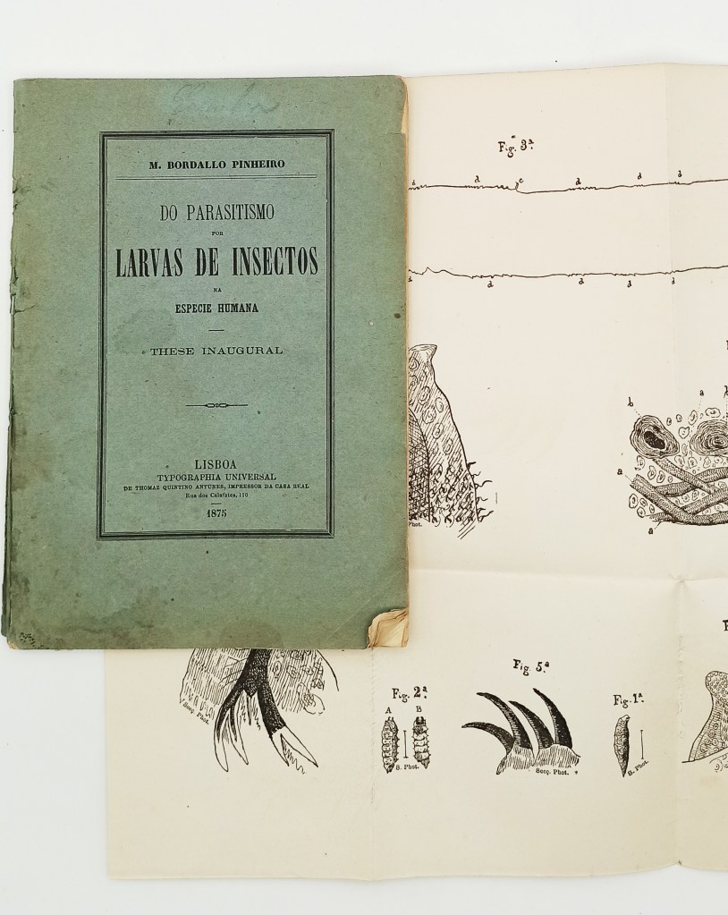 Trabalho de Manuel Maria Bordallo Prostes Pinheiro (n. 1850) sobre o parasitismo por larvas no organismo humano. Este trabalho, apresentado como “These Inaugural” na Escola Medico-Cirurgica de Lisboa, foi fruto de uma observação de um caso concreto dos “trinta e dois vermes” expulsos por uma mulher, estudados e observados por Bordallo Pinheiro que os apresenta “numa estampa representando ora a lavra inteira, ora as suas diferentes partes augmentadas conveninentemente para que possa perceber-se-lhe bem os acidentes (…)”.